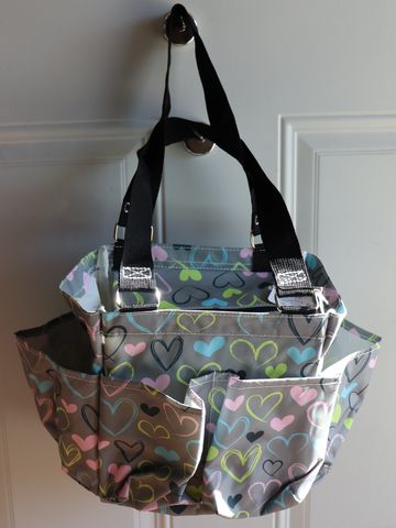 Utility, Grooming, Bath Tote. Carry accessories and essentials. It has a Top Zipper Closure to keep all items inside safe and It contains Double Canvas Handles. The Handle Drop is about 10 inches Long.
